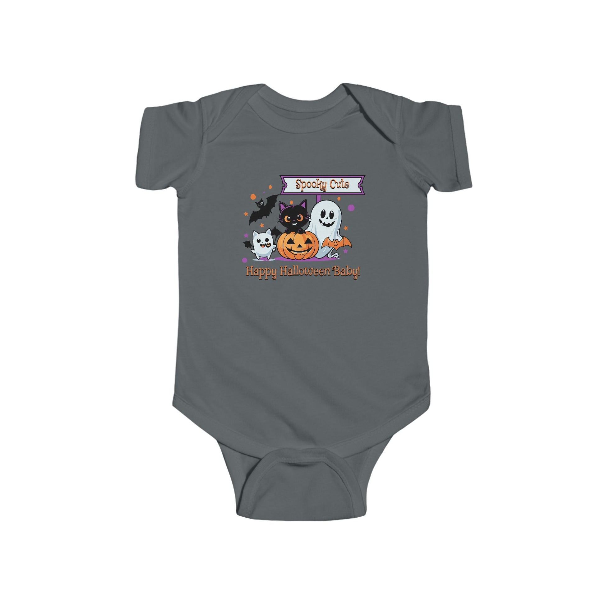 Our Spooky Cute baby onesie is perfect to dress your little pumpkin for the fall season! Our Halloween onesie celebrates October babies and having fun with your little one during this Halloween time. The fabric is 100% cotton for solid colors and is both durable & soft. For heather colors, polyester is included. There are seams along the sides and all bindings are made with ribbed knitting for improved durability. There are plastic snaps at the cross closure for easy changing access.