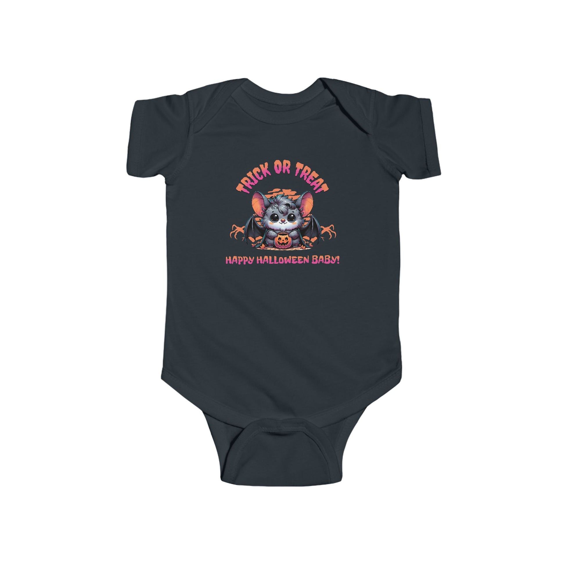This Halloween onesie celebrates October babies and having Halloween fun with your little one. A spooky cute baby vampire onesie that says Trick or Treat, Happy Halloween Baby! The fabric is 100% cotton for solid colors and is both durable & soft. For heather colors, polyester is included. There are seams along the sides and all bindings are made with ribbed knitting for improved durability. There are plastic snaps at the cross closure for easy changing access.